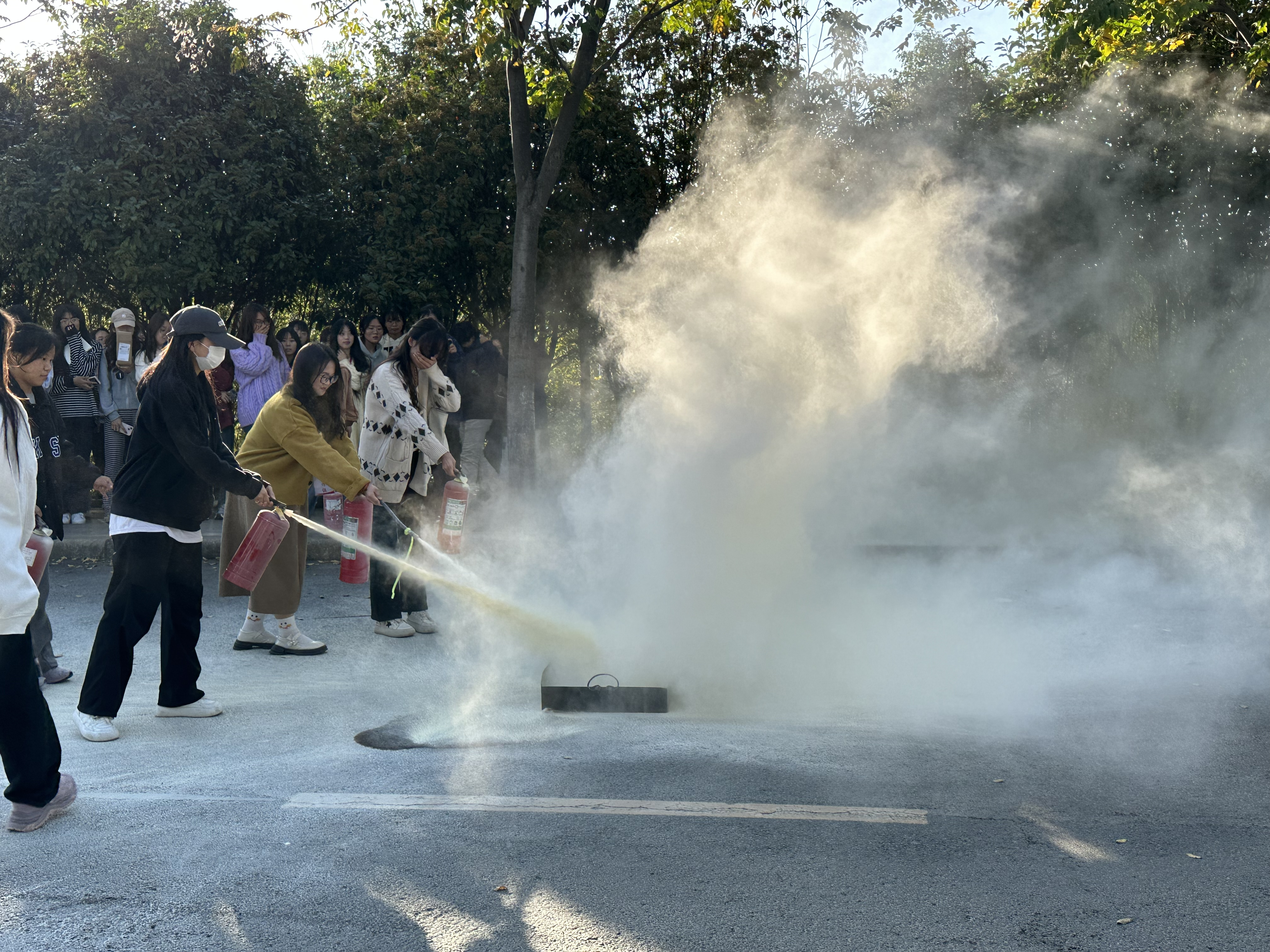 最后是灭火演练,吴长城等老师在教学楼下现场讲解、示范了干粉灭火器的使用方法,不同原因导致火灾的有效灭火措施,提醒大家学会在保证自身安全的同时尽量把灾的损失降到最低。