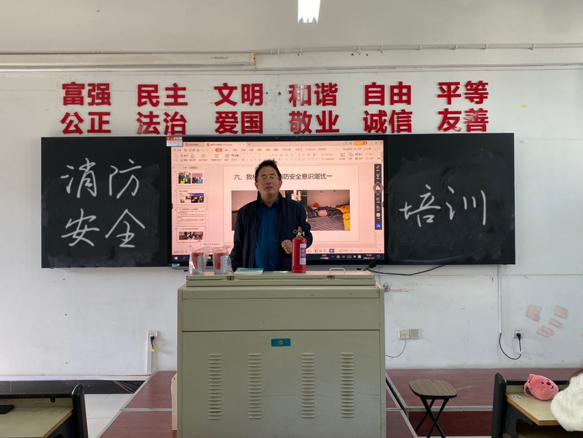 首先,吴长城老师带领师生观看了消防安全知识视频,讲解了火灾分类,灭火方式,家用电器、燃气、油锅等防火自救注意事项以及灭火器、灭火毯、烟感报警器的正确使用方法,呼吁大家积极向家人、朋友科普消防安全知识及消防器材的使用方法,提高自我防范意识。培训过程中,吴长城老师结合典型案例,介绍了火灾产生的原因、火灾现场要具备的正确逃生方法,要求大家引以为戒、保持警惕,特别是学生宿舍用电安全问题。