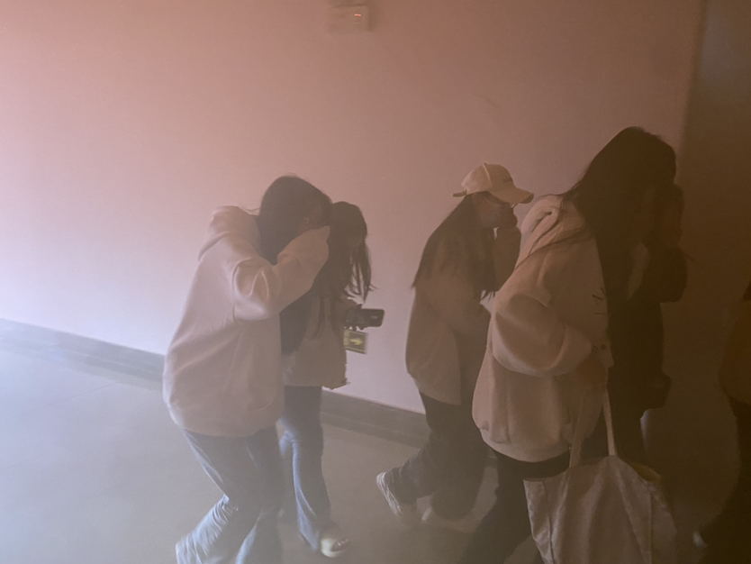 然后,吴长城老师等消防科工作人员组织师生在j成人毛片A级四楼模拟浓烟四起的火灾现场,进行疏散、逃生演练。