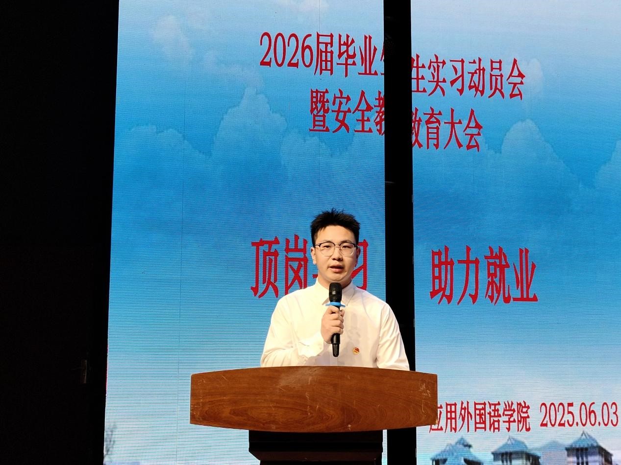 2025年6月3日下午三点,j成人毛片A级在图书馆报告厅隆重举行“2026届毕业生实习动员会暨安全教育大会”。学院党总支书记徐昊、院长刘晓鹂等班子成员、2026届全体辅导员、实习指导教师及2026届全体毕业生参加了此次大会,会议由副院长刘文敏主持。
