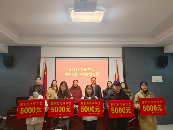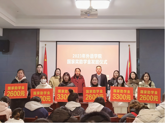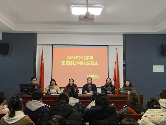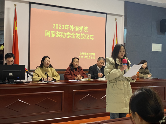 发放仪式开始,刘孟璞老师首先介绍了参会老师及学生代表。随后由蒋曾书记宣读本次奖助学金获奖学生名单。国家励志奖学金获得者2021级英教三班孟博、国家助学金获得者2021级英教五班马文艳依次发言,表达了对国家及学校资助政策的感恩,并表示会以实际行动感谢党和国家的恩情,感谢学校的教育和培养。