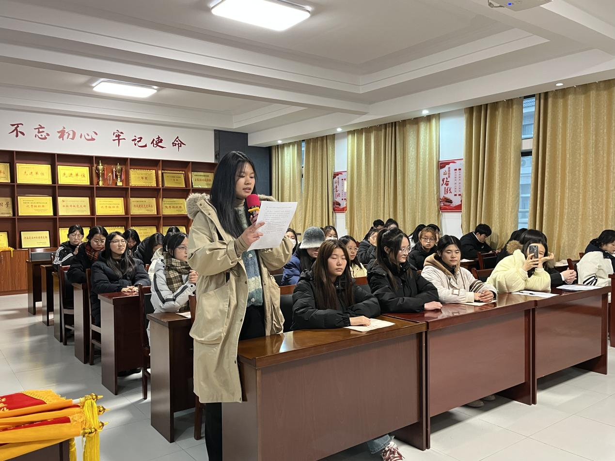 会议第一项,主持人宣布“先进班集体、先进个人、文明宿舍”名单,与会老师给获奖的集体和个人颁发荣誉证书和奖品,并合影留念。会议第二项,“先进个人”代表王一宁发言,她表示在生活学习中自己求真务实、一丝不苟,在工作中恪尽职守,建立起老师与学生之间沟通的桥梁。会议第三项,张泽锋发表总结讲话,对获奖集体和个人的突出表现给予了充分的肯定和祝贺,希望大家发挥榜样作用,敢于担当,奋力前行。