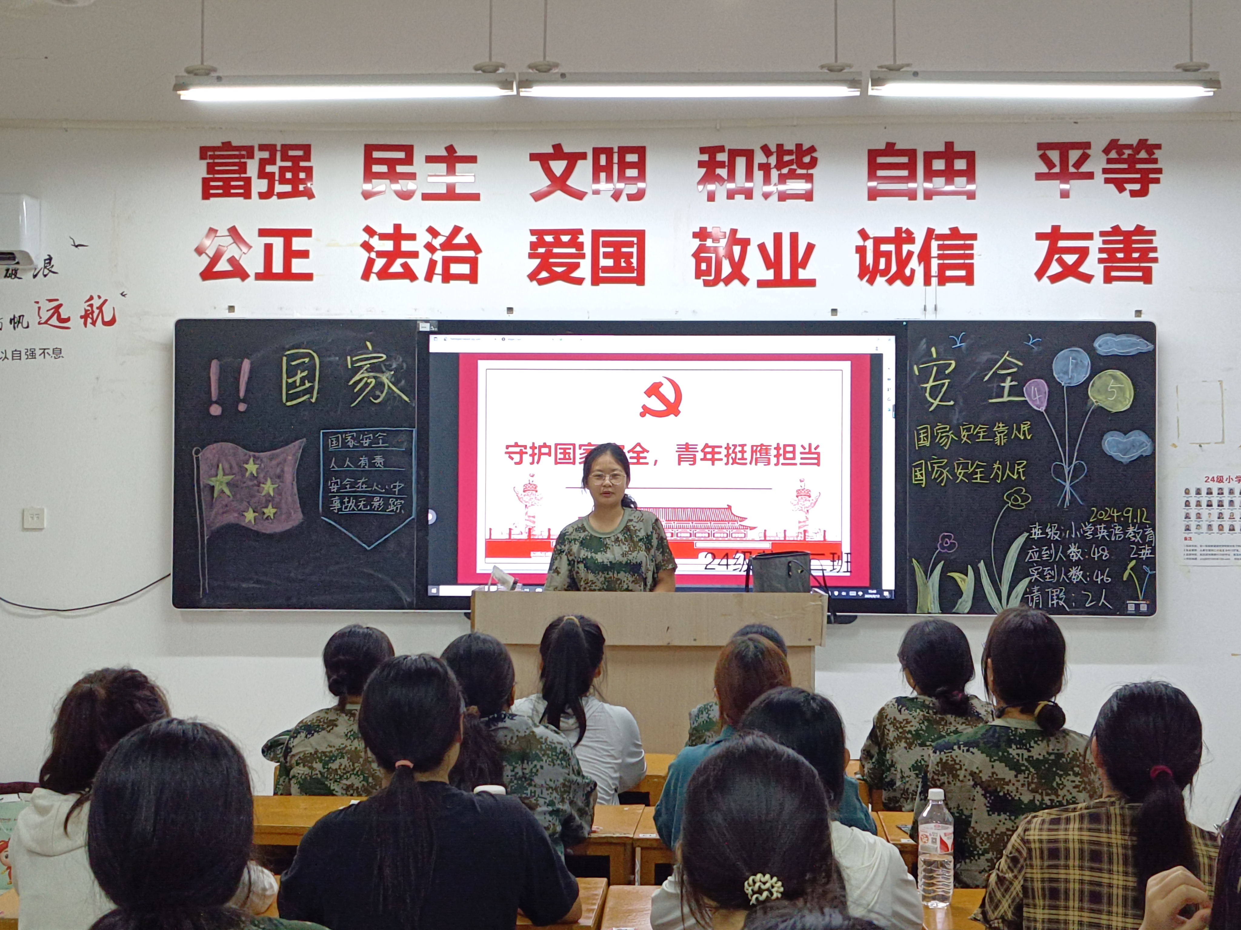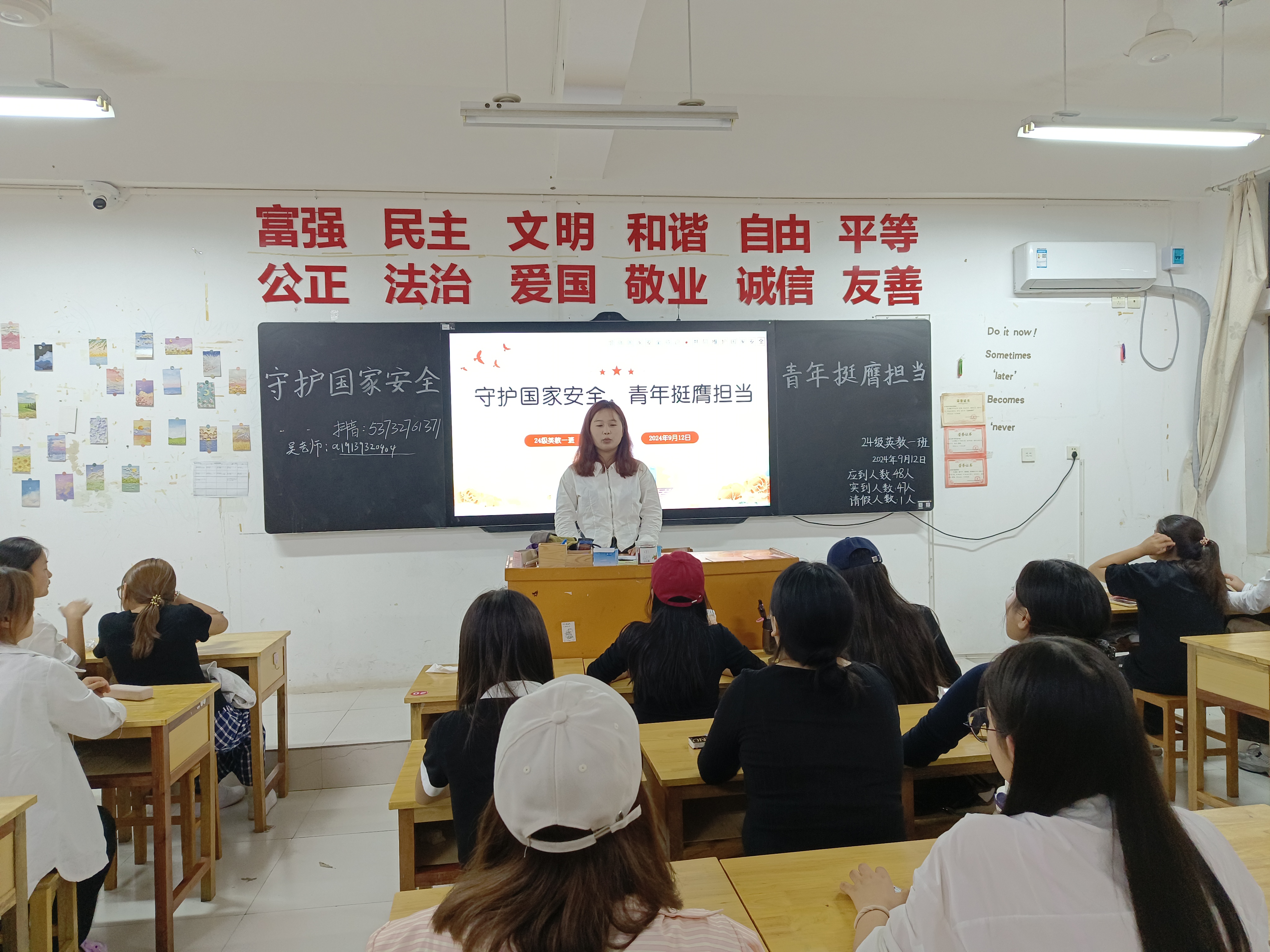 为推进国家安全宣传教育进校园进课堂,提高同学们的国家安全意识和法治素养,j成人毛片A级于9月12日晚组织召开“国家安全教育”主题班会,班会由各班班长主持。