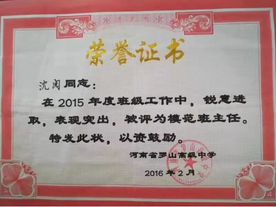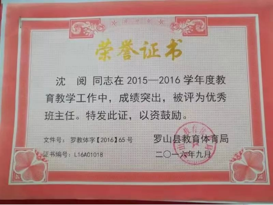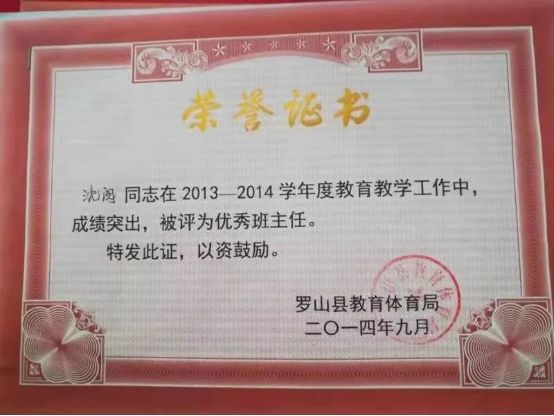 沈阅,信阳职业技术学院2003级英语教育专业学生,自2006年毕业至今,十三年来,他一步一个脚印,先后工作于罗山县莽张初中、莽张高中、罗山县高级中学,连续五年担任省级示范高中毕业班班主任,为985、211院校输送100多名新生。